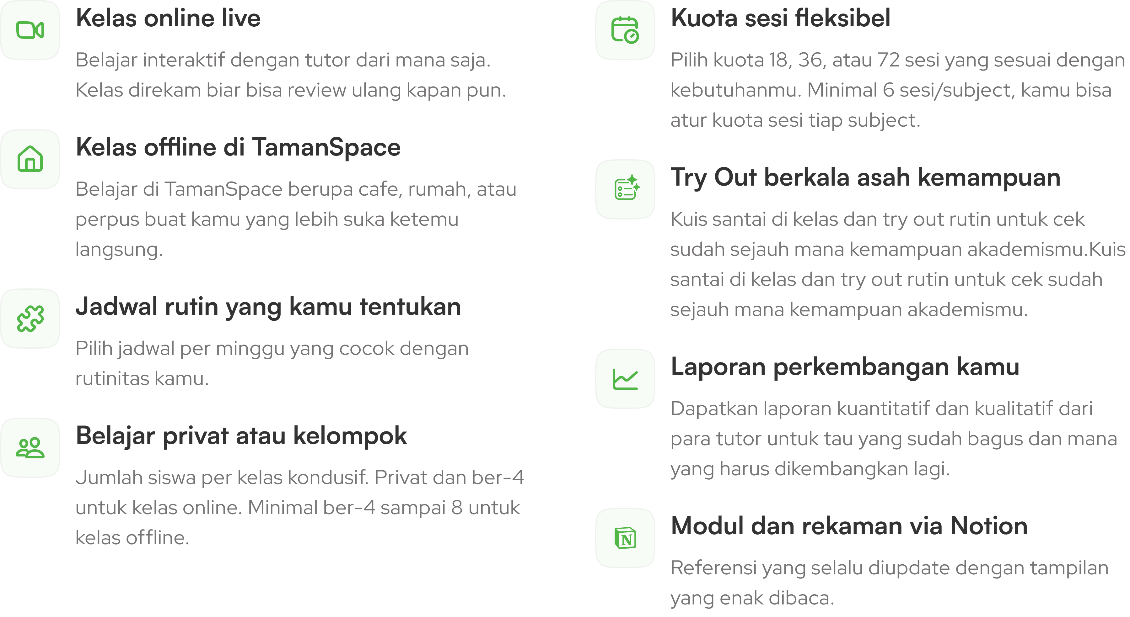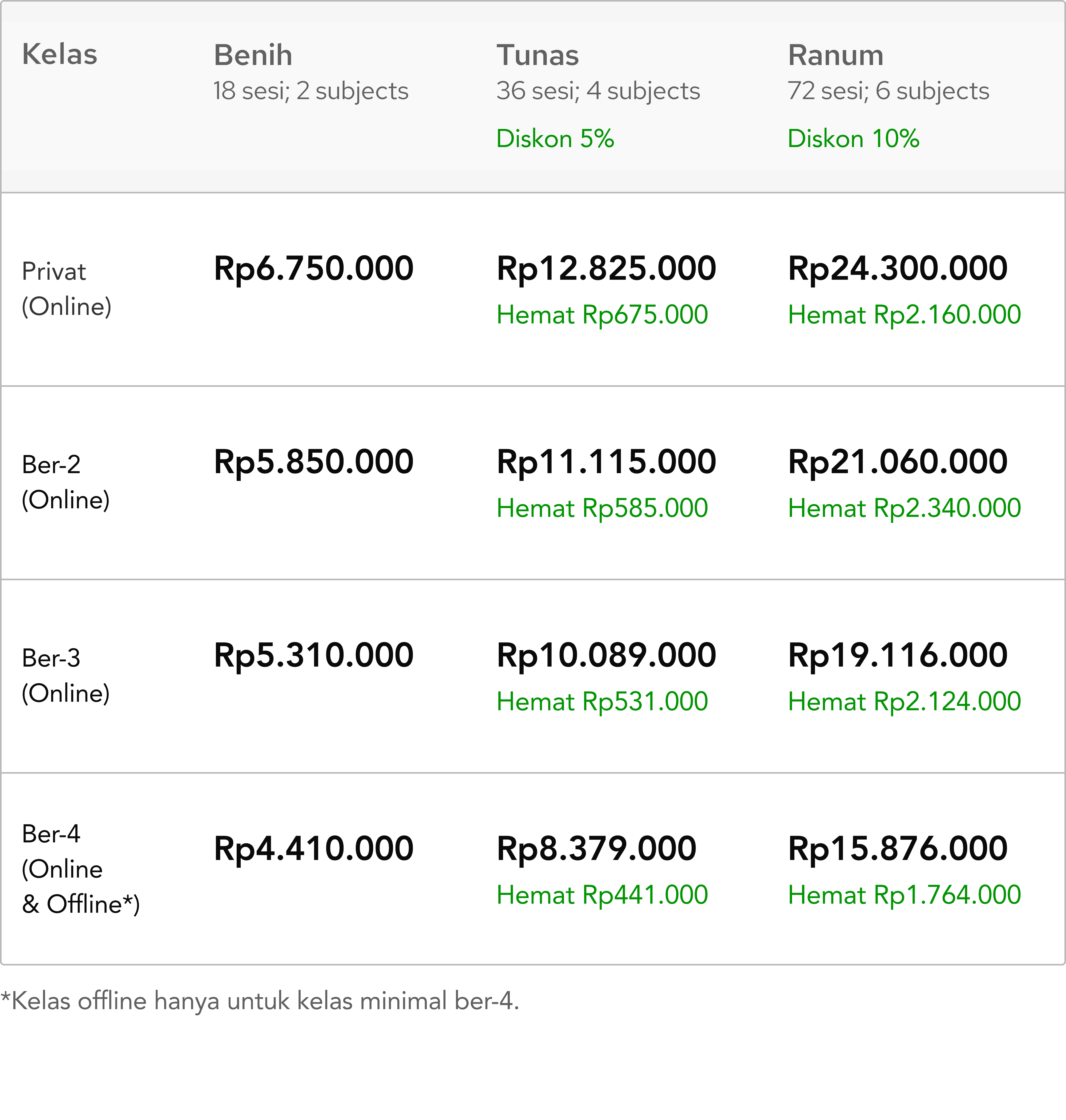 Kelas Kurikulum Nasional untuk pendalaman konsep dan optimasi nilai rapor, serta materi UTBK untuk persiapan kuliah.