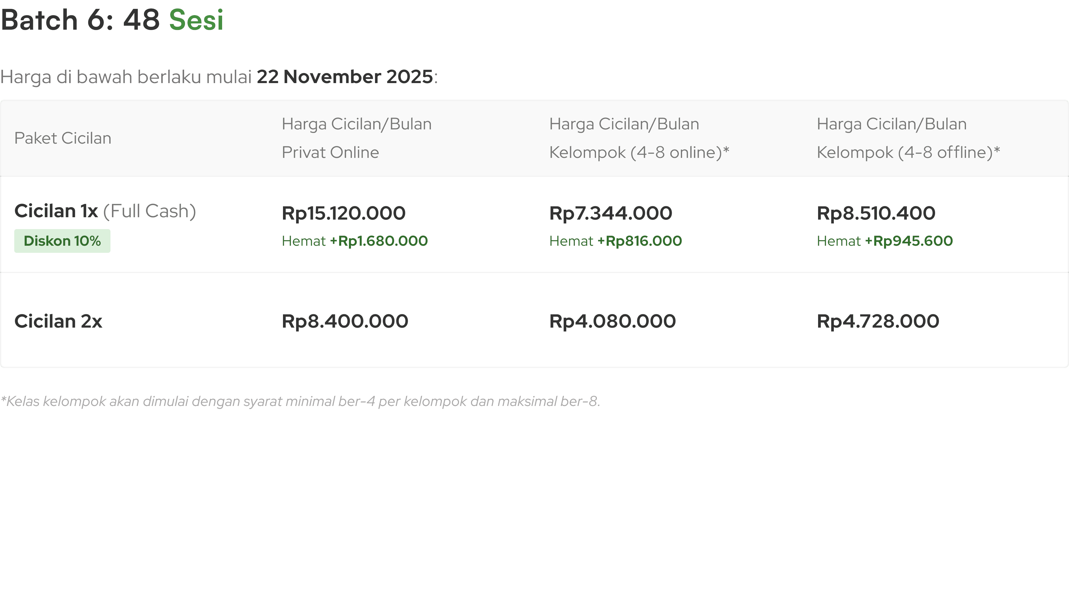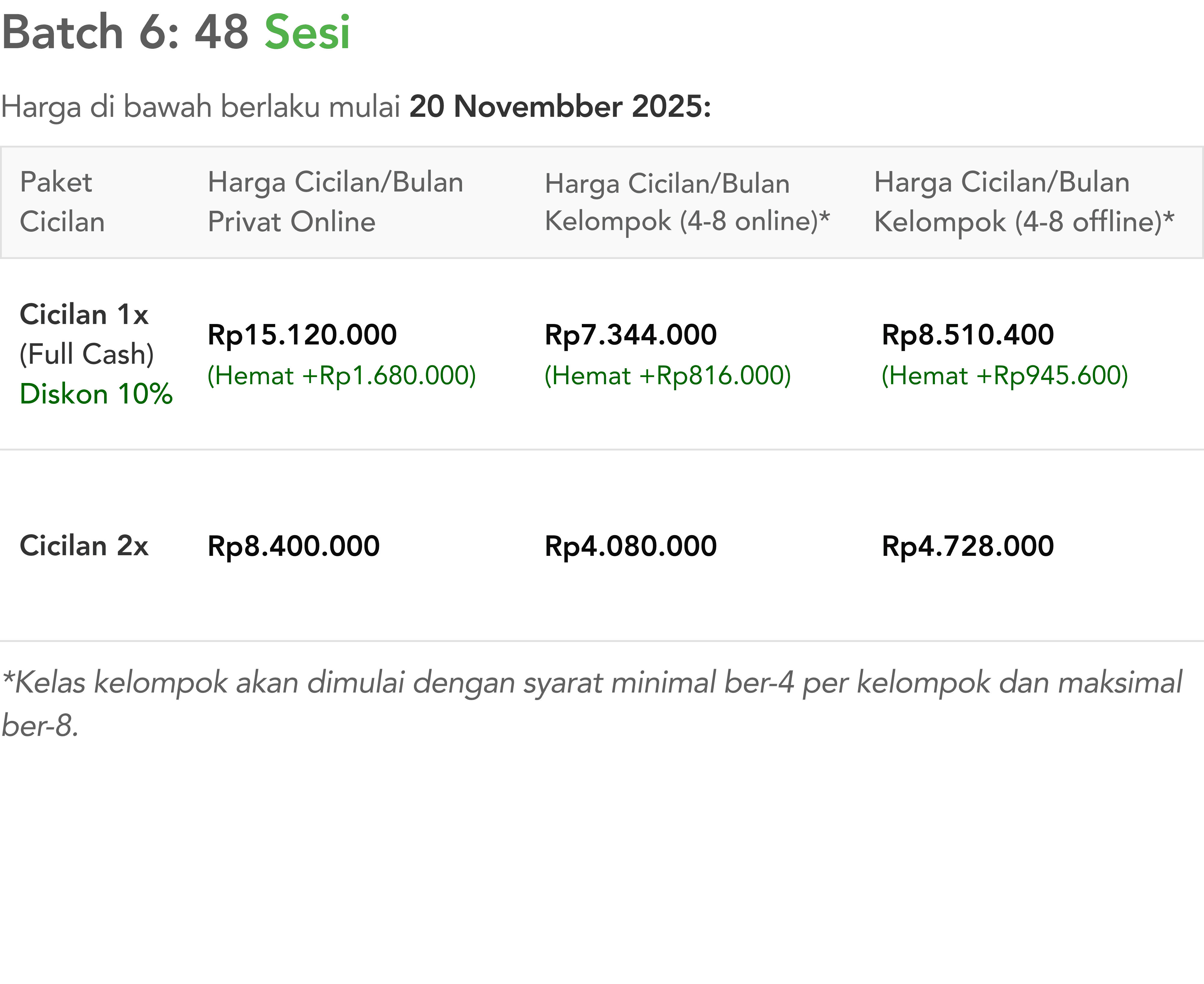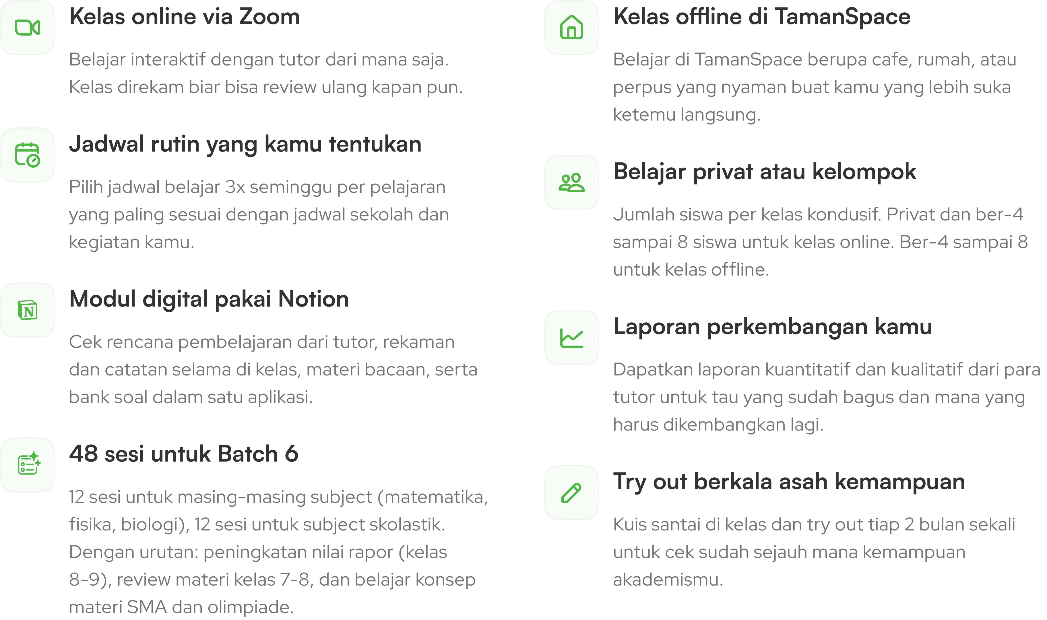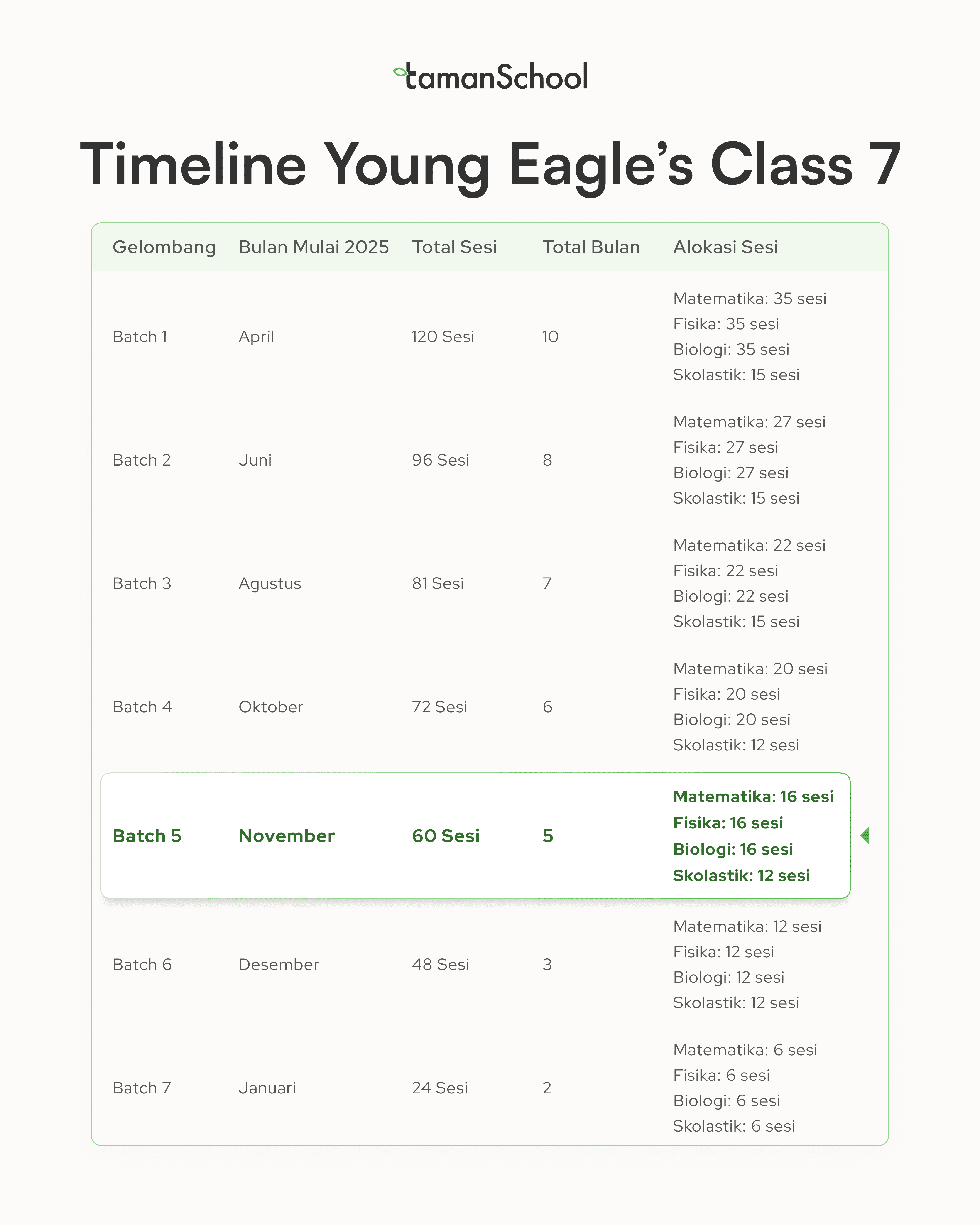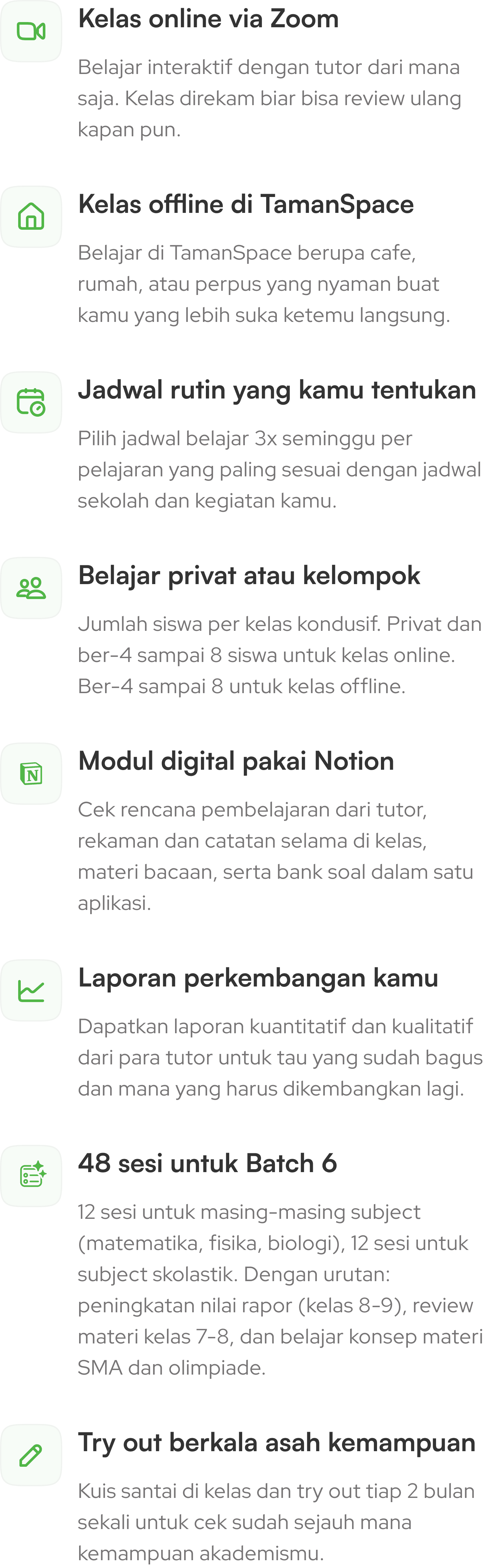 48 sesi yang bener-bener siapkan kamu sampai level SMA dan olimpiade. Bukan cuma drill soal biasa, tapi bangun fondasi biar ga kaget pas udah masuk sekolah unggulan.